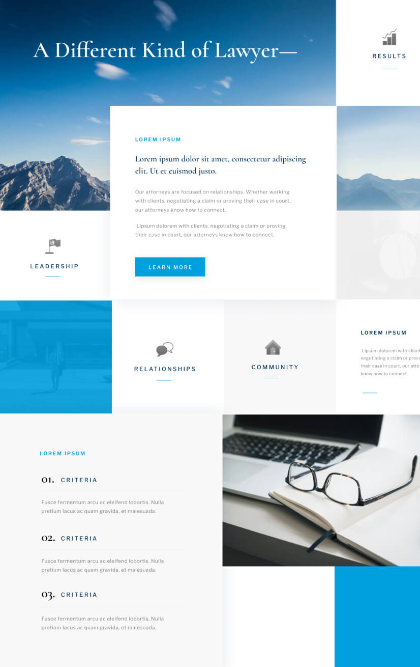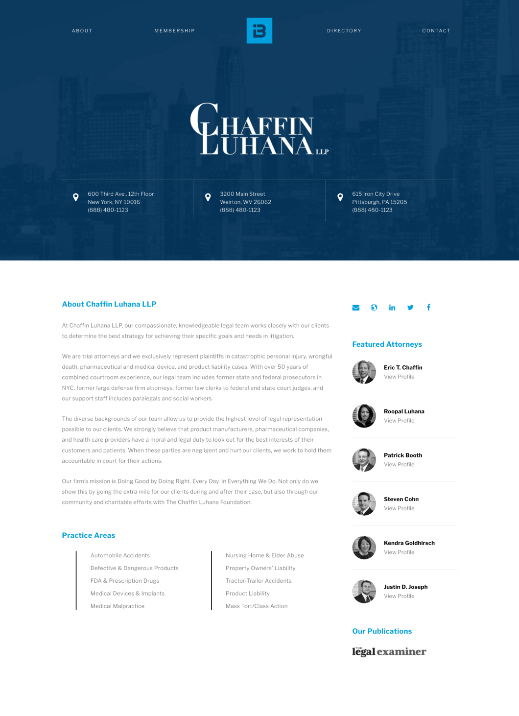 Across other pages on the site we applied these same principles. Firm pages were updated to give content previously squeezed into a tight three column layout more breathing room for easier scanning for users. We also needed to consider flexible layouts that would be balanced regardless if firms had one to multiple addresses, attorneys or social media channels and various lengths of copy for any given section.