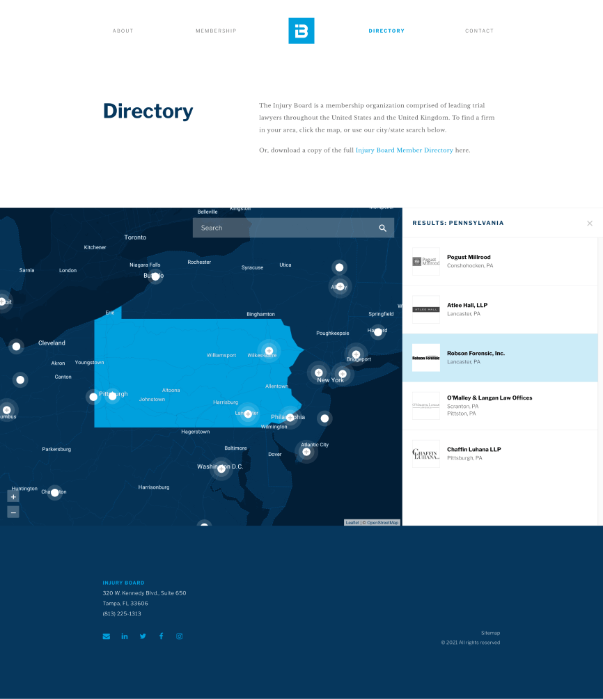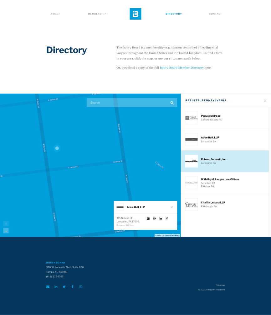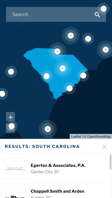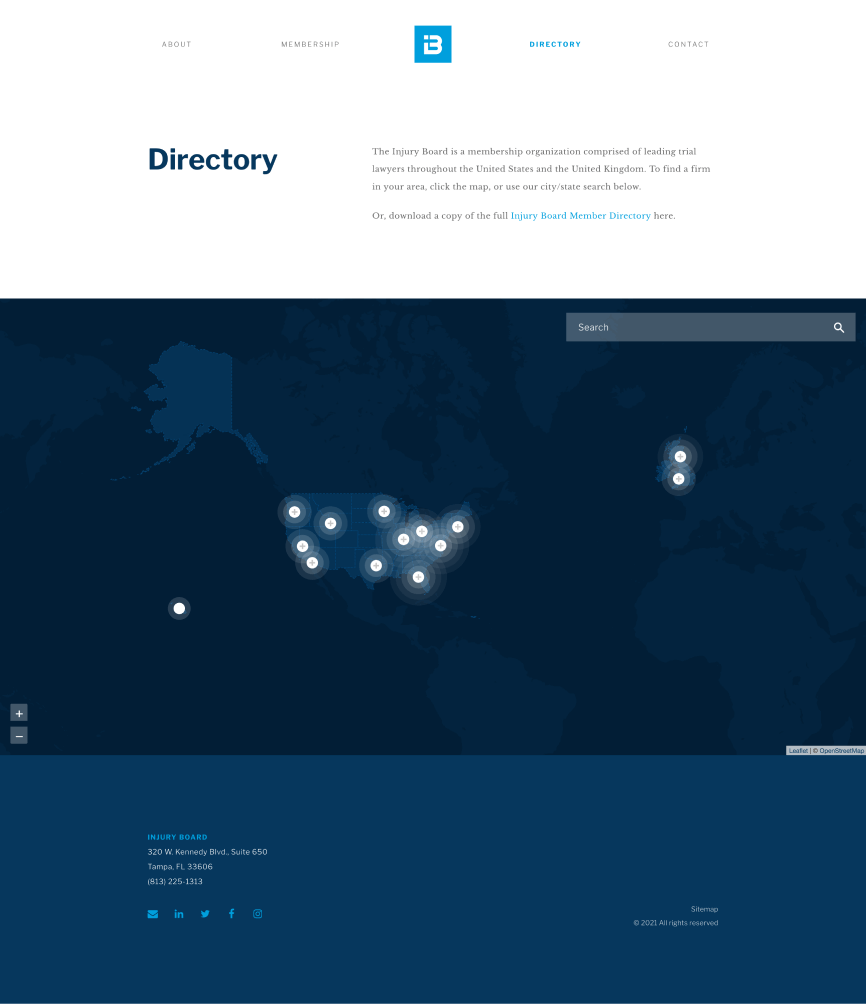 We applied this new look to other pages like the directory. The existing site used a standard Google Maps embed to search and show firms. It was cluttered with the number of markers and extraneous icons. Given the emphasis on simplicity we streamlined the map to outlines of countries, states and cities and street names at higher zoom levels to avoid information overload. The map was also a good opportunity to introduce greater interactivity to create a stand-out experience stakeholders had voiced as being important earlier in the project.