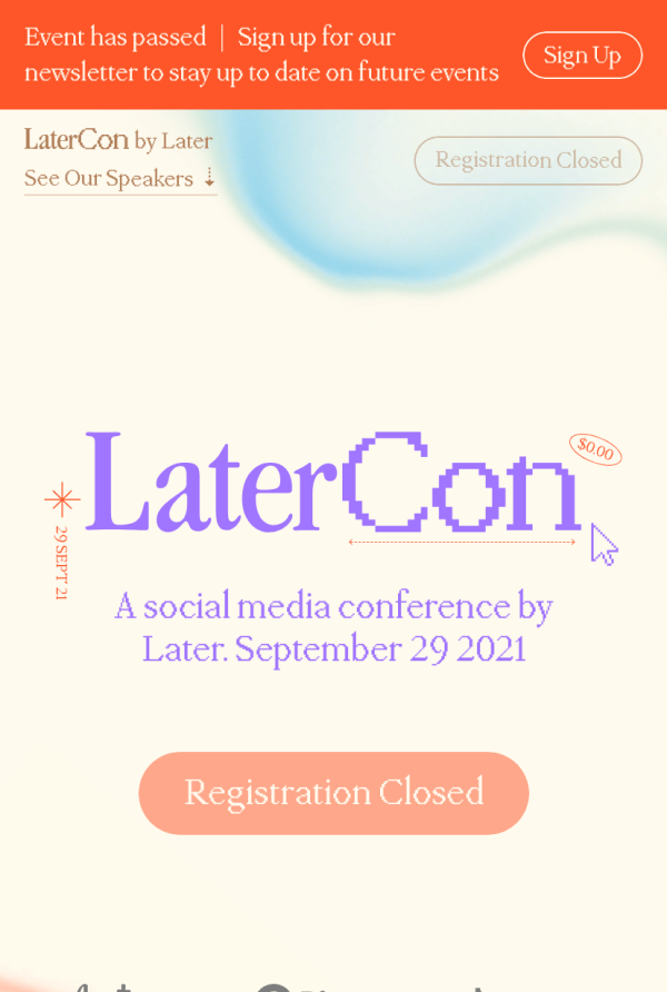 LaterCon is organized by Later's content marketing team. After months long planning and preparation they were looking to have a landing page created to announce and promote it. The Creative Director finalized a custom art direction the month before and was in the process of completing the landing page visual design, which left a timeline of a little over two weeks to complete development. Expectations were also high for this year's LaterCon as the previous year saw a 60 percent increase in sign-up and attendance numbers. The marketing team wasn't expecting to replicate 2020 success as the pandemic played a unique role in this, but set ambitious targets nonetheless.